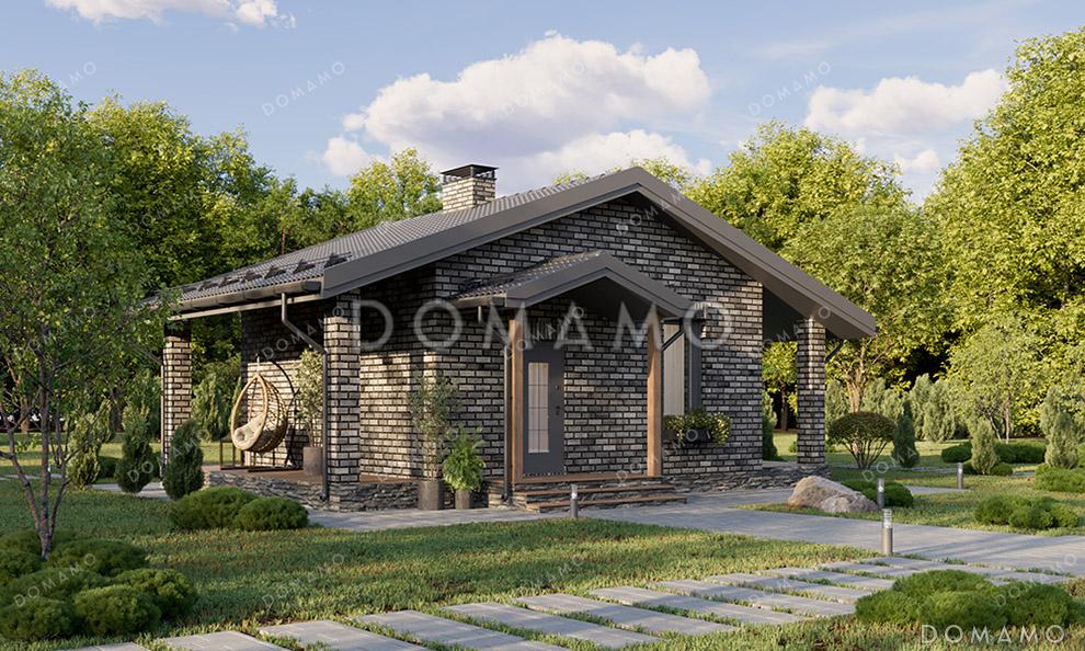 Баня D6161 Проект компактной одноэтажной бани в классическом стиле с большой террасой, витражным остеклением и просторной комнатой отдыха