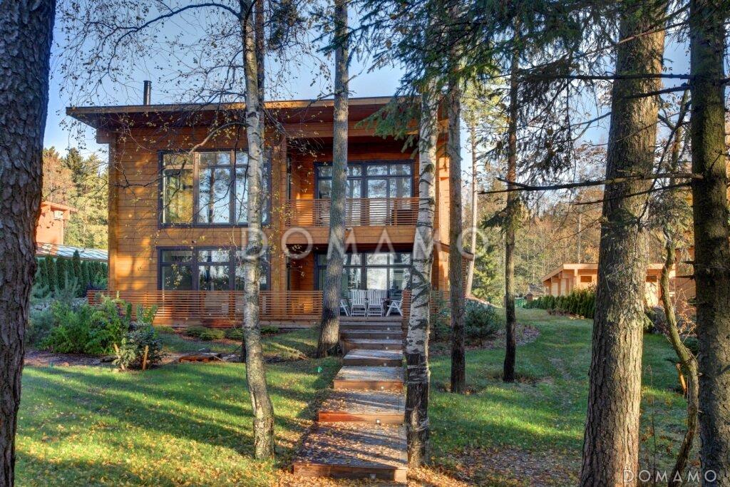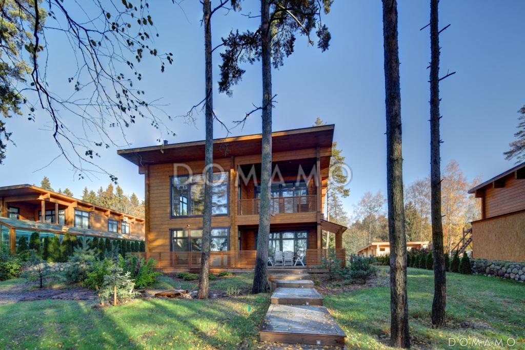 Почти половину первого этажа занимает гостиная площадью 51 кв.м и кухня-столовая с выходом на террасу. Выделена зона с сауной и комнатой отдыха. Сразу около входной двери расположена комната, в которой будет удобно сделать гостевую спальню. Вспомогательные помещения включают в себя котельную, постирочную, гардероб, 2 санузла. На втором этаже размещены 3 спальни, одна из которых хозяйская с санузлом и гардеробом. В четвертой жилой комнате на этом этаже можно сделать кабинет. В спальнях есть балконы и панорамные окна.
