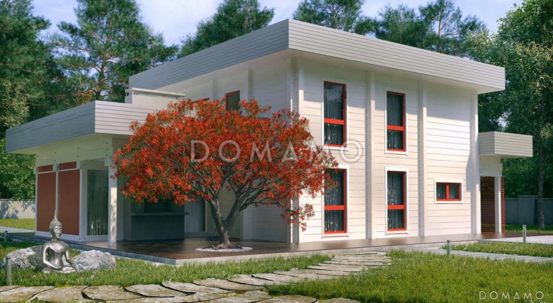 Монументальное жилое сооружение, выполненное в стиле модерн, вместит в своих стенах многочисленное семейство и им не придется сталкиваться друг с другом, если они не захотят. Белые стены в комплекте с красными рамами панорамных окон смотрятся стильно и необычно. Под плоской кровлей находятся два этажа. Внизу здания расположились: универсальная спальня-студия, из нее 2 отдельных двери ведут на террасу. С учетом современных тенденций кухонный блок и место отдыха совмещены, при входе в особняк спроектировано помещение для гардеробной, а затем санузел. Наверху создано по две комнаты, кроме кабинета, там есть спальни и санузлы.