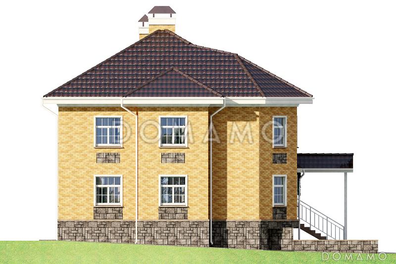 Монументальный пентхаус с подземным гаражом, по факту получается в три этажа. В цокольном находится гаражное отделение для двух автомобилей, топочная и кладовая. Высокий фундамент, выступающий эркер на два этажа, да еще использование декоративного кирпича желтого цвета наделяют постройку необычным видом. Крытое крыльцо с высокой лестницей ведет в прихожую, сбоку от нее гардеробная. Далее попадаешь в гостиную с эркером, потом идет огромная спальня со своей гардеробной, всего (34м2). Сверху 4 комнаты отдыха и ванная.