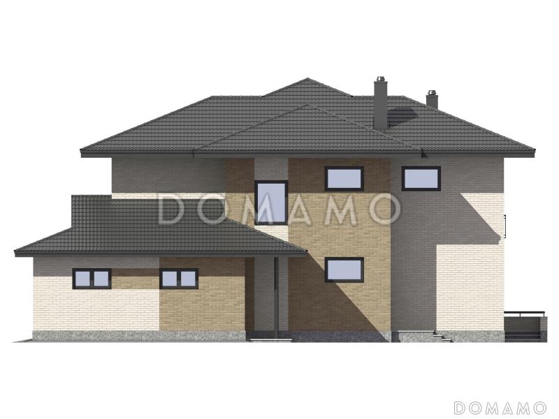 Двухэтажный особняк в европейском стиле, который подойдет для жизни большой семьи из пяти-шести человек. Панорамные окна, расположенные по всему периметру дома, делают экстерьер очень элегантным. В проекте также предусмотрено наличие большого гаража с двумя парковочными местами.