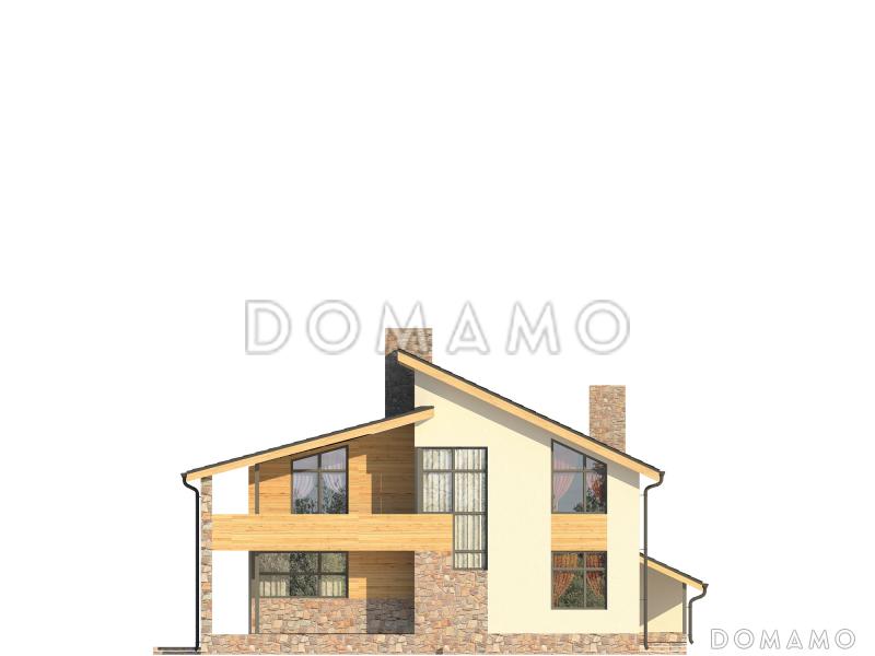 Мансардный коттедж с четырьмя просторными спальнями отлично подойдет для семьи из четырех-пяти человек. Дом из пенобетона построен в минималистичном стиле, внешние стены оштукатурены и декорированы вагонкой. Цоколь и трубы облицованы камнем.