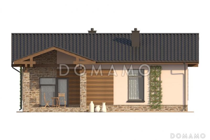 Одноэтажный домик с отделкой деревом и облицовочным камнем смотрится по-настоящему сказочно. С широкого крыльца, обрамленного колоннами, можно попасть в котельную и в тамбур с переходом в прихожую. С задней стороны коттеджа размещена уютная крытая терраса с выходом из жилой зоны, где можно устроить вечер на двоих у столика с креслами.