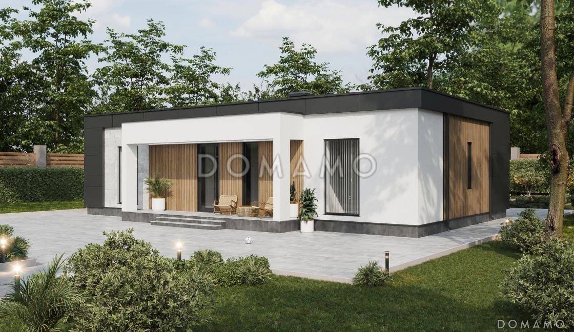 D5871 Проект одноэтажного газобетонного дома в стиле хай-тек с двумя спальнями, кабинетом и крытой террасой