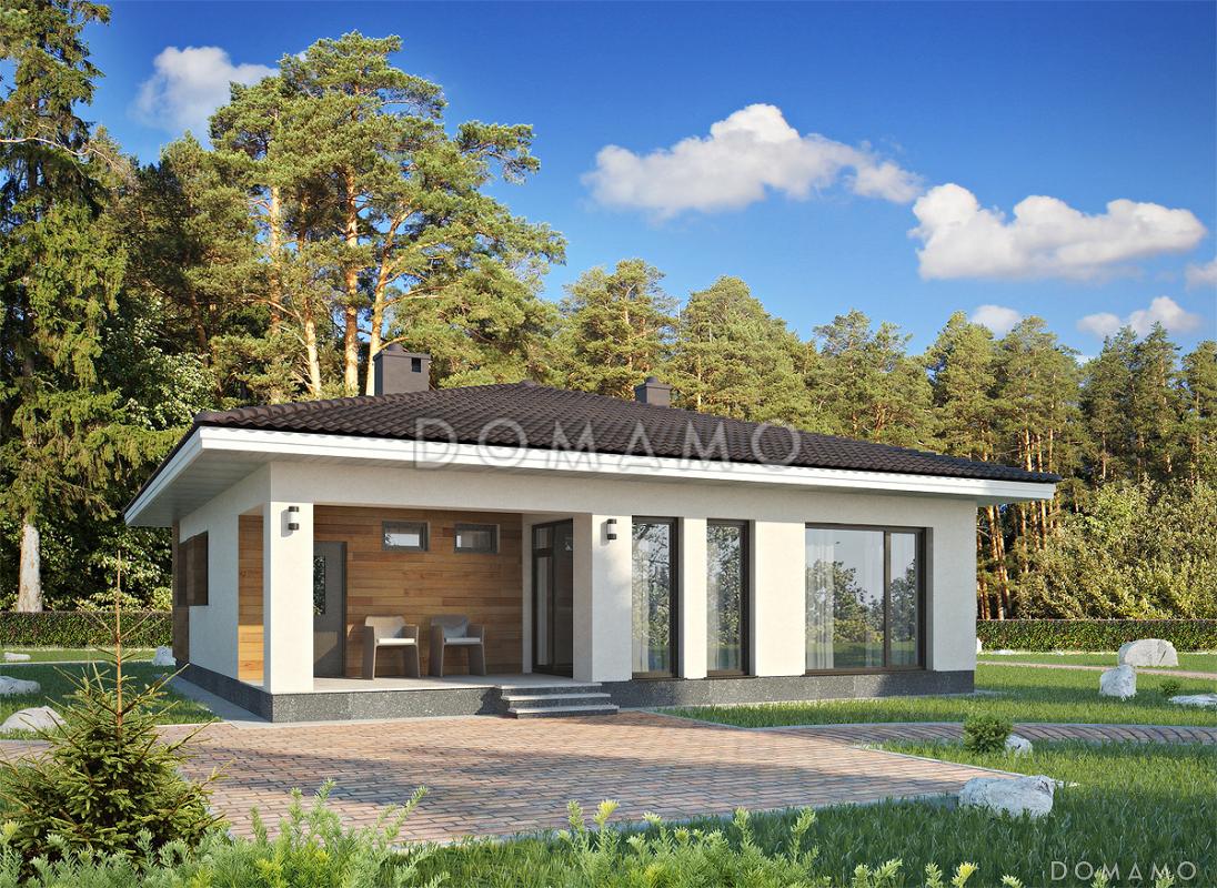 Проект одноэтажного коттеджа, выполненного в минималистичном стиле, который отлично подойдет для проживания небольшой семьи из трех-четырех человек. Экстерьер постройки украшают большие панорамные окна, расположенные по всему ее периметру. Они же обеспечивают отличное освещение внутри комнат. С задней стороны дома – небольшая крытая терраса, где хозяева смогут установить уличную мебель для отдыха. Проект включает в себя просторную гостиную с местом под камин, объединенную с кухней и столовой, а также три спальных комнаты.