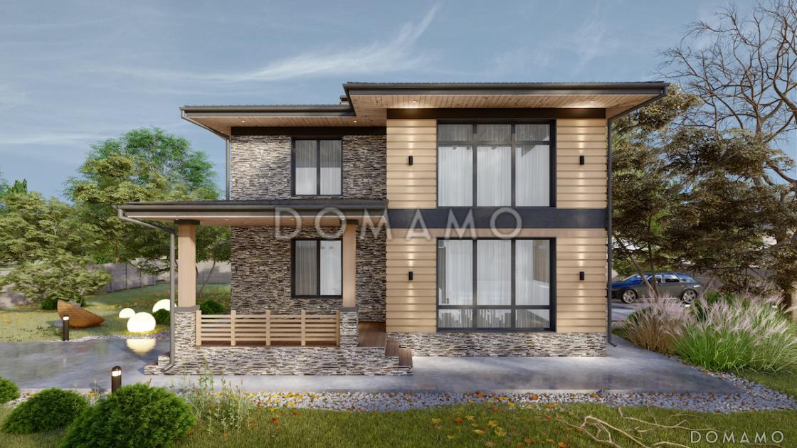 Компания Domamo предлагает проект двухэтажного дома из газобетона с окнами в пол и вторым светом D6835. Общая площадь - 153 м2, размер - 10.5х10 м. Фундамент - монолитная ж/бетонная плита, кровля - металлочерепица, внешняя отделка - фасадные панели облицовка камнем. Для заказа проекта или внесения изменений свяжитесь с нами с помощью форм обратной связи на сайте или по телефону +7 (831) 231-05-01.