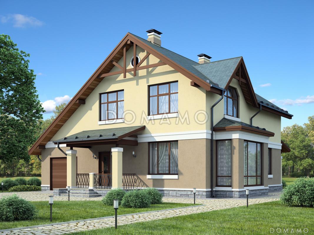 Проект современного двухэтажного коттеджа из пеноблоков, который отлично подойдет для проживания в нем семьи из пяти-шести человек. Визуально дом поделен на две части, так как в отделке используется декоративная штукатурка двух разных пастельный оттеков – более темного для первого этажа и более светлого - для второго. Это создает приятную контрастность во внешнем виде постройки. Дом также украшает эркер и большое количество панорамных окон на мансардном этаже. Первый этаж включает в себя большую кухню-столовую, гостиную, а также гостевую комнату и гаражное помещение с двумя парковочными местами. Здесь же расположена крытая терраса. Второй этаж занимают три спальных комнаты и ванная с санузлом.