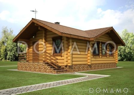 Проект просторной бани из клееного бруса с кровлей из натуральной черепицы и облицованным камнем цоколем. Из тамбура дверь ведет в раздевалку, в которой расположен санузел. Далее находится комната отдыха с четырьмя окнами. Душевая оборудована небольшим бассейном и имеет выход на улицу.