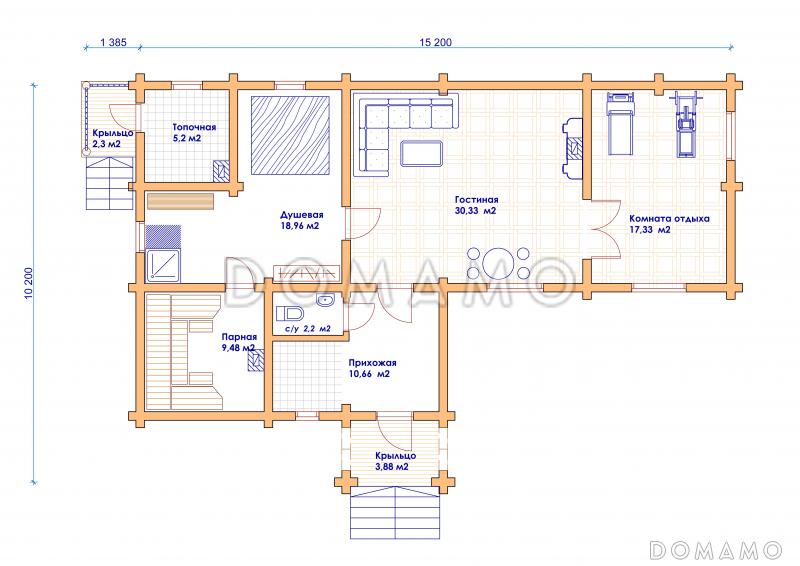 Внутри расположена большая парная с выходом в душевую и далее — в гостиную с комнатой отдыха, куда можно пройти и расслабиться после посещения бани.