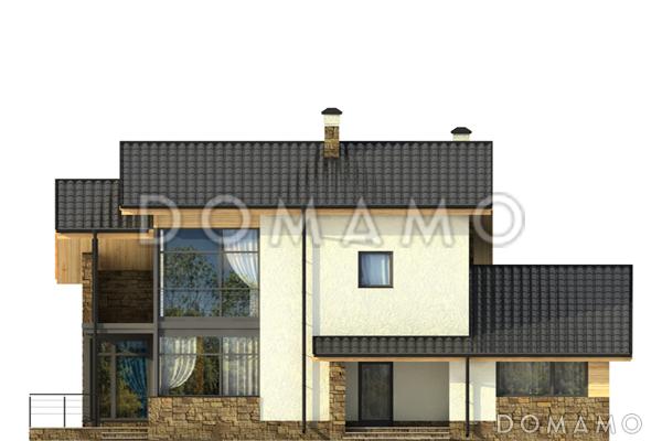 На цокольном этаже организована зона отдыха, включающая в себя просторную сауну, комнату отдыха с бильярдной, спортзал. Вторая функция подвала — это размещение подсобных помещений: кладовой и котельной. В центре первого этажа расположен лестничный холл, из которого можно пройти во все остальные помещения. В кухне-столовой находится выход на террасу. Ванная дополнена хозблоком для стирки и сушки белья. На этом этаже размещены 2 спальни, остальные 3 расположены на мансарде.
