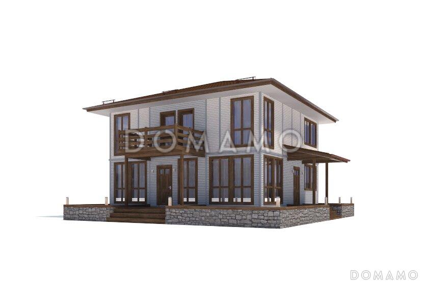 Проект дома с тремя спальнями подходит для строительства коттеджа для семьи из четырех-пяти человек. Двухэтажный дом из клееного бруса обшит деревянной вагонкой. Разнообразие в экстерьер привносят несимметрично расположенные окна в пол и балкон с перилами из массивных брусков.
