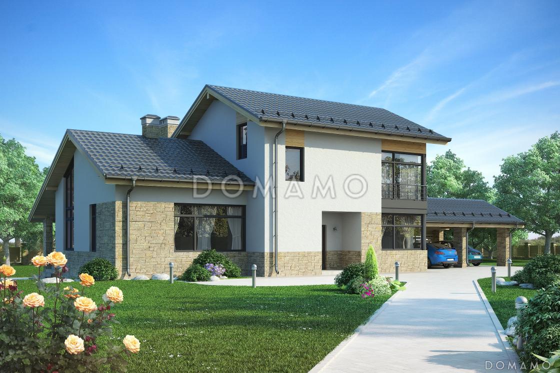 Проект современного двухэтажного коттеджа, который подойдет для проживания большой семьи из пяти-шести человек. Здание выделяют большие панорамные окна и декоративные элементы из натурального камня. Проект дома предусматривает наличие навеса с парковочными местами для двух автомобилей и просторную крытую террасу у входа. На первом этаже расположена кухня-столовая с выходом в гостиную, а также две спальных комнаты. Второй этаж включает в себя три спальни, в одной из которых предусмотрен собственный гардероб и санузел. Здесь же находятся помещения, обеспечивающие второй свет на кухне и в гостиной.