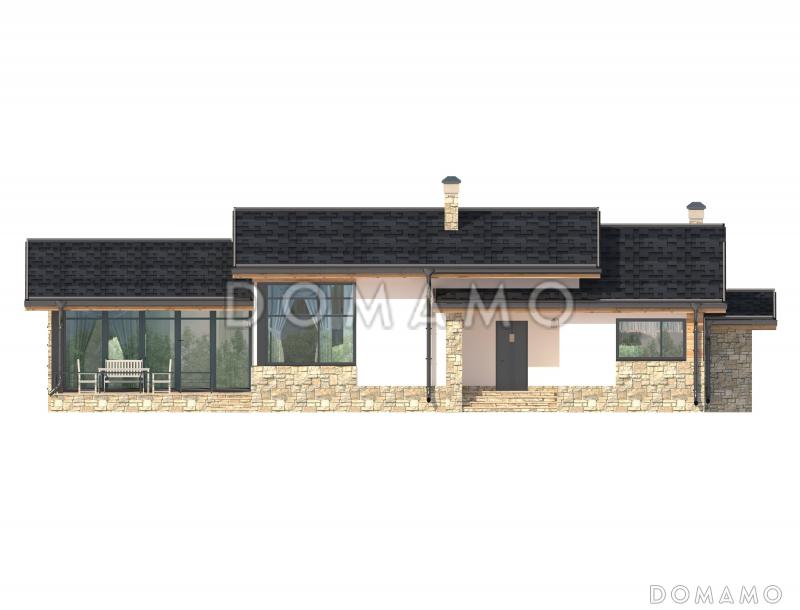 Одноэтажный дом из пенобетона с просторной кухней-столовой и тремя спальнями – это отличный вариант для комфортной жизни небольшой семьи из 3-4 человек. Симпатичное решение для оформления внешнего вида такого здания – сочетание панорамных окон и облицовки светлым камнем.