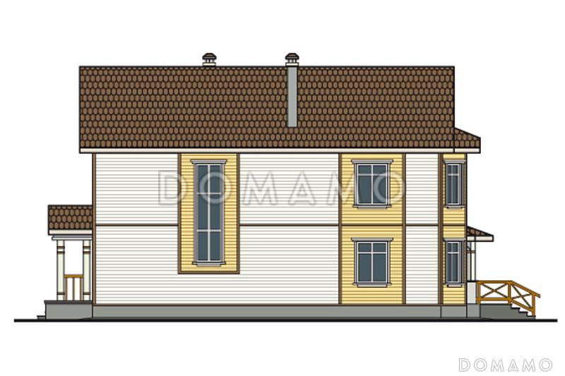 Уникальный узкий дом, ширина которого в два раза меньше его длины, но в нем могут разместиться 3-5 человек. Экстерьер здания очень эффектный: игра двух оттенков стен, отделенных темными полосами, отдельно пристроенное крытое крыльцо с колоннами, а под самой крышей круглые окна, задняя сторона украшена эркером. Интерьер гостиной с таким архитектурным приемом, как эркер, можно обыграть необычно. Второй этаж разделяется на несколько спальных зон и объединенную ванную с санузлом.