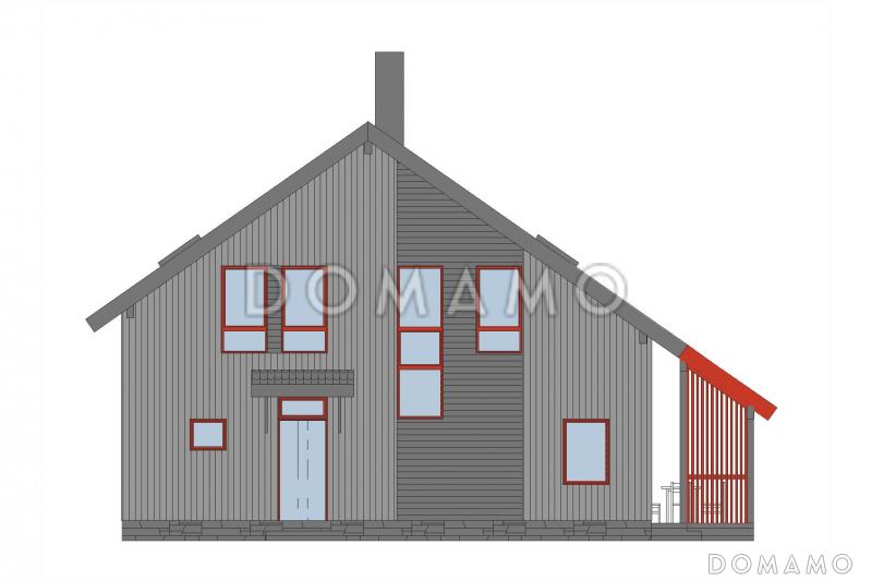 Стильный дом с четырьмя спальнями и кабинетом подойдет для семьи из 4-5 человек. Внешний вид дома интересен разнородной облицовкой и яркими акцентами. Стены частично обшиты деревянной вагонкой, частично — камнем. Фасад украшают оформленные в красном цвете оконные рамы, двери, навес над крыльцом.