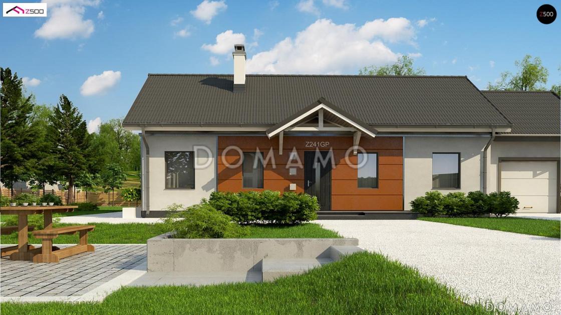Одноэтажный коттедж с тремя спальнями и двумя санузлами станет уютным жильем для семьи из 3-4 человек. Кирпичный дом оштукатурен, а стены террасы и входа обшиты фасадными панелями контрастного оттенка.