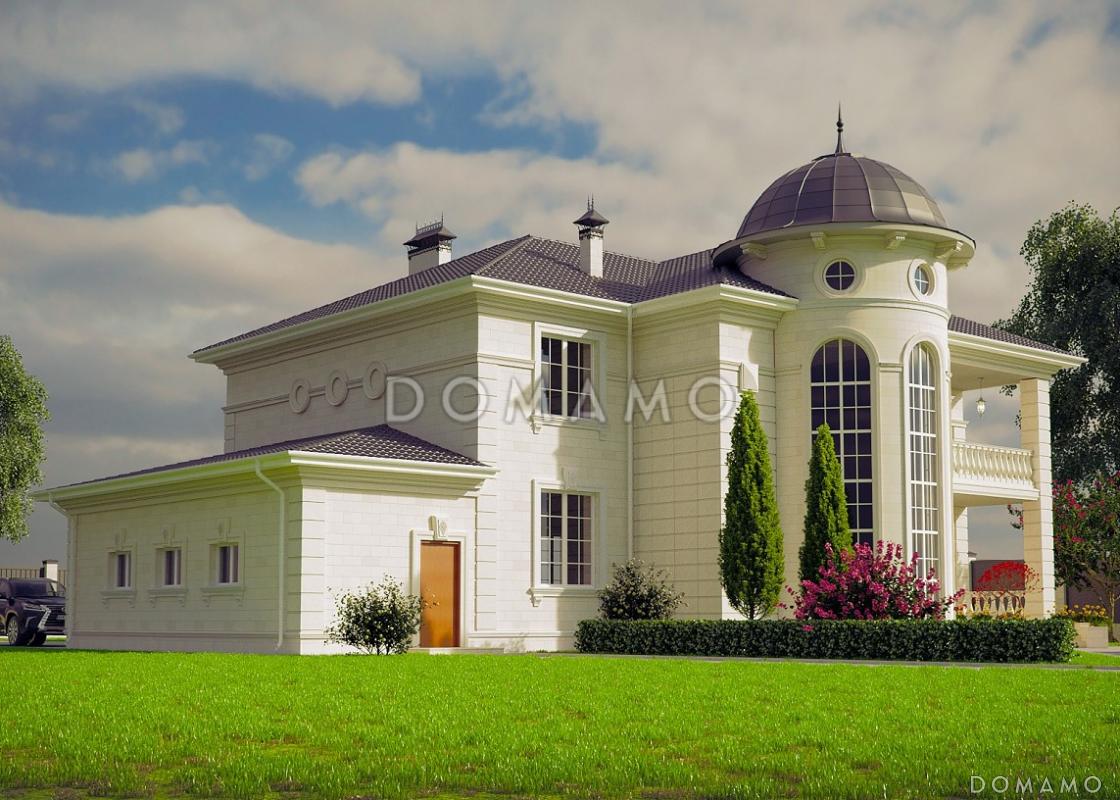 Компания Domamo предлагает проект двухэтажного дома в византийском стиле из газобетона с двумя круглыми эркерами и гаражом D2061. Общая площадь - 420 м2, размер - 20х15 м. Фундамент - монолитная ж/бетонная плита, кровля - металлочерепица, внешняя отделка - облицовка камнем. Для заказа проекта или внесения изменений свяжитесь с нами с помощью форм обратной связи на сайте или по телефону +7 (831) 231-05-01.