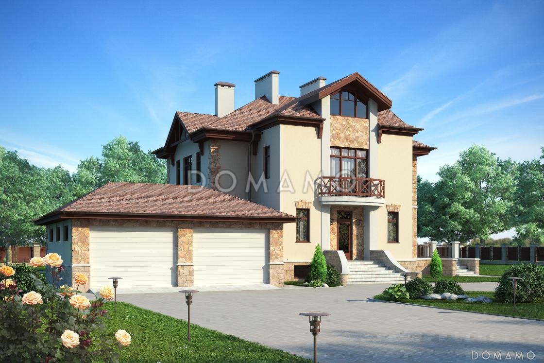 Проект дома с бассейном и просторной комнатой отдыха в цокольном этаже, сауной, гаражом на два автомобиля, открытой террасой, столовой с эркером / 1 Проект дома с бассейном и просторной комнатой отдыха в цокольном этаже, сауной, гаражом на два автомобиля, открытой террасой, столовой с эркером / 2