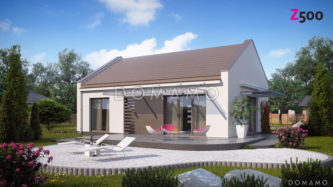 Проект компактного одноэтажного дома из газобетона с двумя спальнями и большой угловой открытой террасой  / 1 Проект компактного одноэтажного дома из газобетона с двумя спальнями и большой угловой открытой террасой  / 2