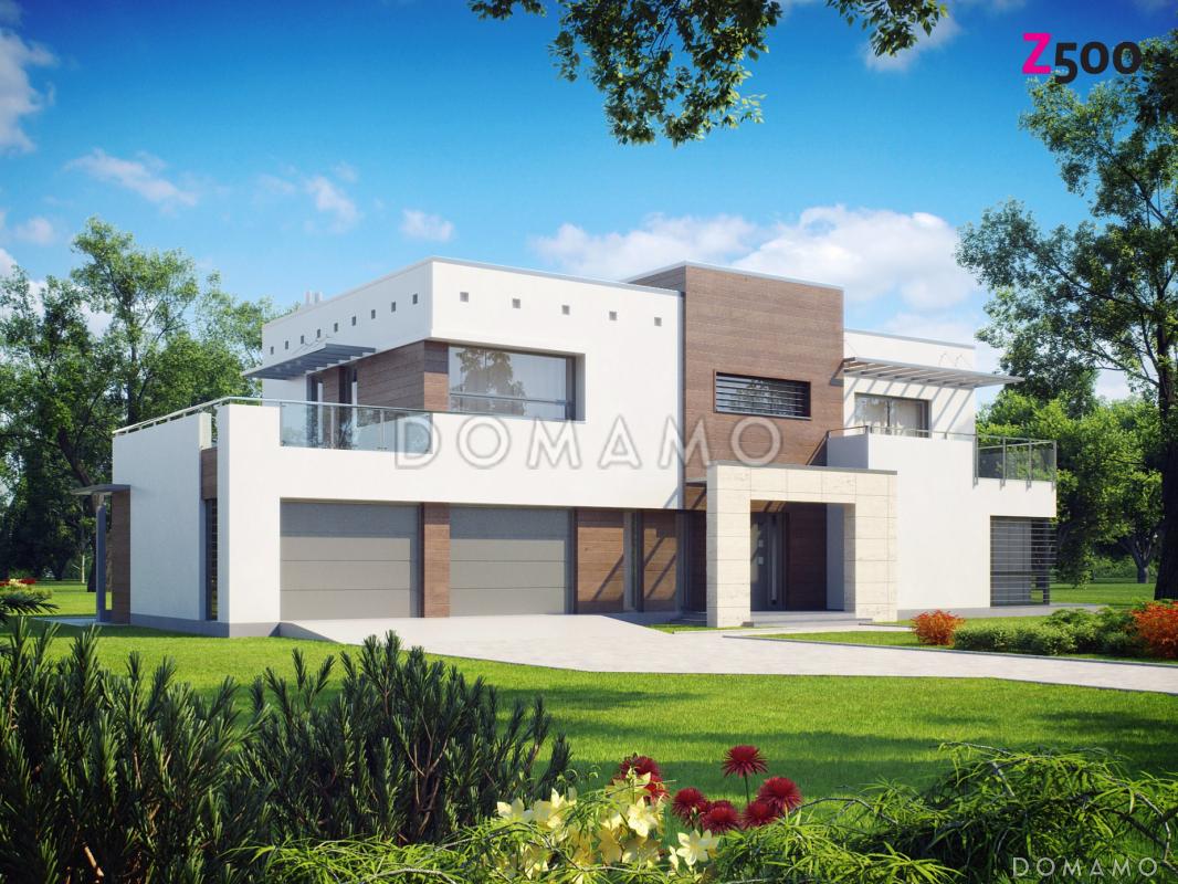 Проект современного двухэтажного дома в стиле хай-тек из кирпича с плоской крышей, балконом и гаражом с двумя отдельными въездами / 1 Проект современного двухэтажного дома в стиле хай-тек из кирпича с плоской крышей, балконом и гаражом с двумя отдельными въездами / 2