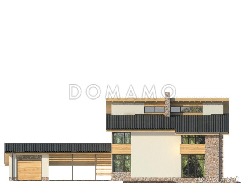 Мансардный коттедж с четырьмя просторными спальнями отлично подойдет для семьи из четырех-пяти человек. Дом из пенобетона построен в минималистичном стиле, внешние стены оштукатурены и декорированы вагонкой. Цоколь и трубы облицованы камнем.