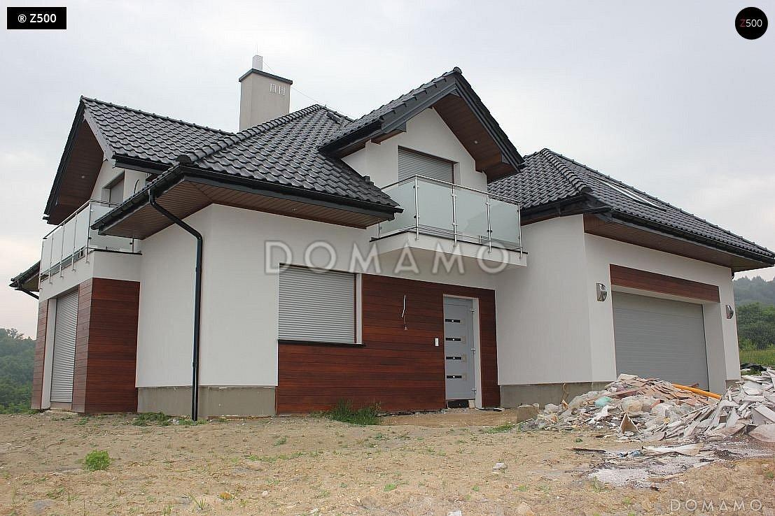 Главная Проекты домов Проект классического одноэтажного мансардного дома из газобетона с дополнительной спальней на первом этаже, с тремя балконами и гаражом на два автомобиля