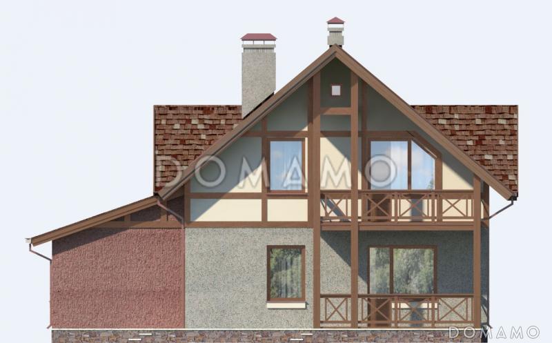 Компактный загородный коттедж, который станет идеальным вариантом для проживания большой семьи из четырех – пяти человек. Внешняя отделка дома выдержана в очень лаконичном стиле. Нижний этаж облицован серой декоративной штукатуркой и красным кирпичом, которые идеально гармонируют и дополняют друг друга. Верхний - украшен элементами фахверка. Отличительной чертой постройки также является красная черепица на крыше, именно она делает ее внешний вид аутентичным. Удобная планировка комнат внутри дома позволяет пяти жилым комнатам разместиться на сравнительно небольшой площади, это делает дом отлично подходящим для узких и небольших участков. Первый этаж включает в себя объединенную кухню-столовую, большую гостиную с выходом на террасу, а также гостевую комнату с собственной кухней. Второй этаж занимают три спальных комнаты, одна из которых предусматривает выход на балкон.