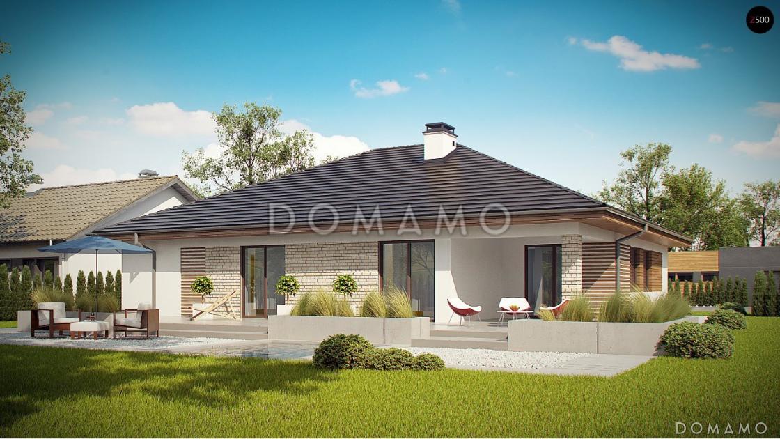 Главная Проекты домов Проект одноэтажного дома с гаражом на две машины, мастер-спальней, кладовой на кухне, террасой