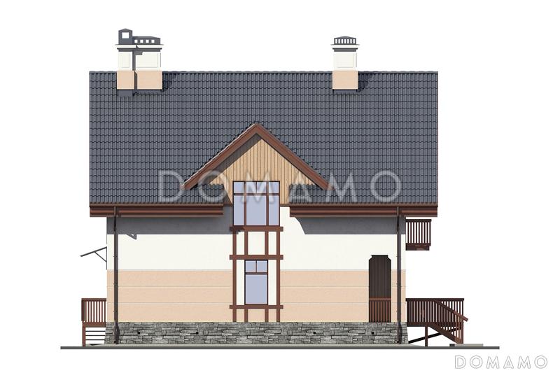 Оригинальный дом с элементами фахверка для семьи из трех-четырех человек. Передний фасад украшает открытая терраса, переходящая в крыльцо, углубленное в основной объем дома и защищенное от непогоды.