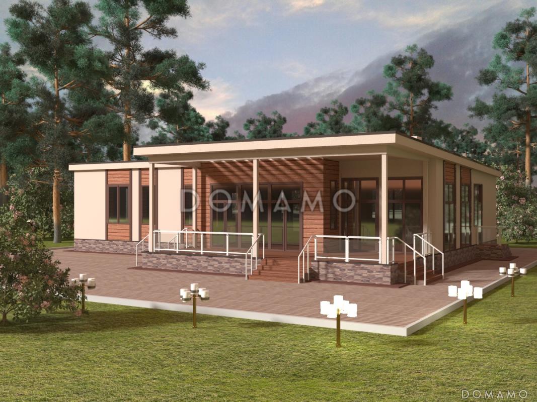 D5100 Проект одноэтажного дома в стиле хай-тек с полуоткрытой террасой и окнами в пол