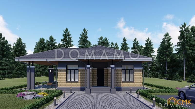 Небольшой дом, подойдет для узких участком. Тем не менее в нем есть все необходимое. Просторная кухня-гостиная, две большие спальни, санузел и гардероб.