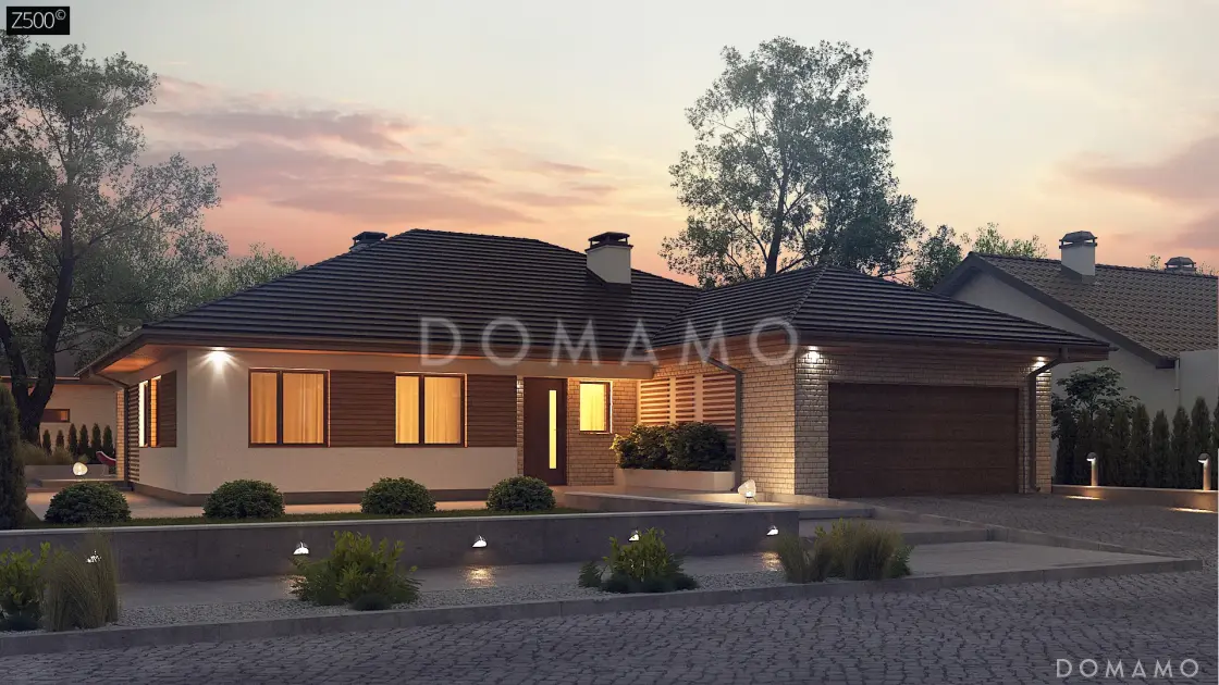 D5849 Проект одноэтажного кирпичного дома с гаражом на 2 автомобиля и подвалом