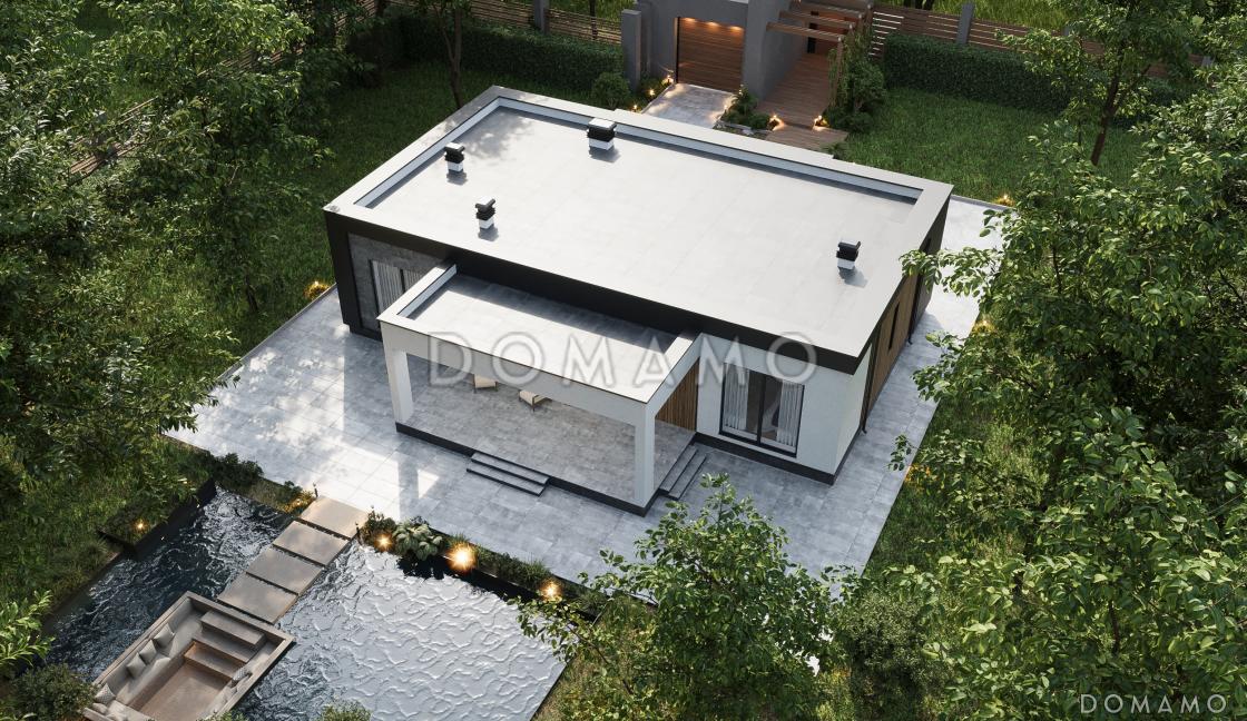 Компания Domamo предлагает проект одноэтажного газобетонного дома в стиле хай-тек с двумя спальнями, кабинетом и крытой террасой D5871. Общая площадь - 181.9 м2, размер - 17.5х15.5 м. Фундамент - малозаглубленные ростверки, кровля - рулонная кровля, внешняя отделка - деревянная вагонка мокрая штукатурка. Для заказа проекта или внесения изменений свяжитесь с нами с помощью форм обратной связи на сайте или по телефону +7 (831) 231-05-01.