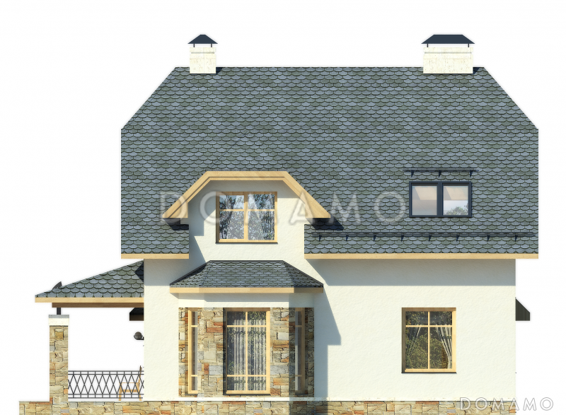 Проект дома из пенобетона с тремя спальнями подходит для строительства загородного дома на семью из 3-4 человек. Фасад в современном стиле украшают колонны террасы и навеса, а также полувальмовая крыша с крутыми скатами.