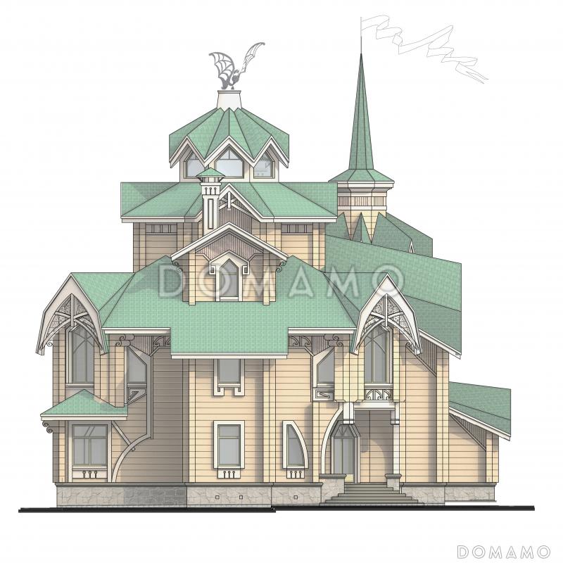 Семикомнатный жилой дом со стенами из клееного бруса решен в формах «деревянного модерна», сочетая западноевропейскую и «неорусскую» стилистику. В объеме дома, построенном на сочетании двух «восьмериков» (восьмерик – традиционное для России название восьмигранного в плане здания), доминирует центральная часть, завершенная шатровой складчатой кровлей. Пространственно ее уравновешивает, придавая динамику композиционному решению, башенка с высоким шпилем. Масштаб, приближающий дом к человеку, создает одноэтажная крытая терраса, плавно огибающая граненый эркер столовой. В центральном «восьмерике» располагается двухсветная гостиная и находящийся над ней мансардный кабинет с антресолью. Объемное решение гостиной подчеркивает центрически расположенный камин-очаг.